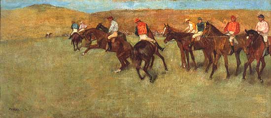 Durante el siglo XIX la burguesía parisina adquirió la costumbre, de origen británico, de acudir al hipódromo a las carreras de caballos. Este es uno de los temas que más frecuentó Degas. Estaba atraido, sobre todo, por la oportunidad que ofrecía para estudiar el tema del movimiento. El desafío consistía en extraer de un amplio repertorio de gestos y movimientos su esencia para congelarlos en una instantánea.